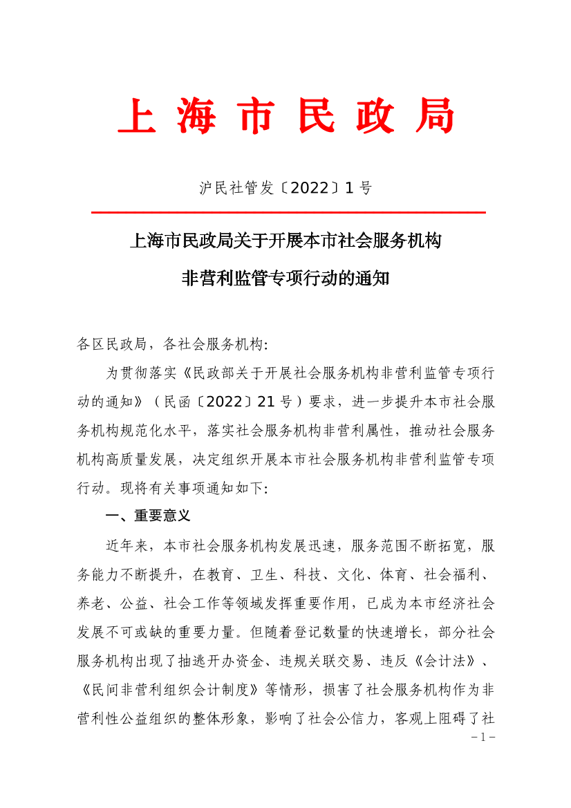 上海市民政局关于开展本市社会服务机构非营利监管专项行动的通知 ( 2022-06-14 )