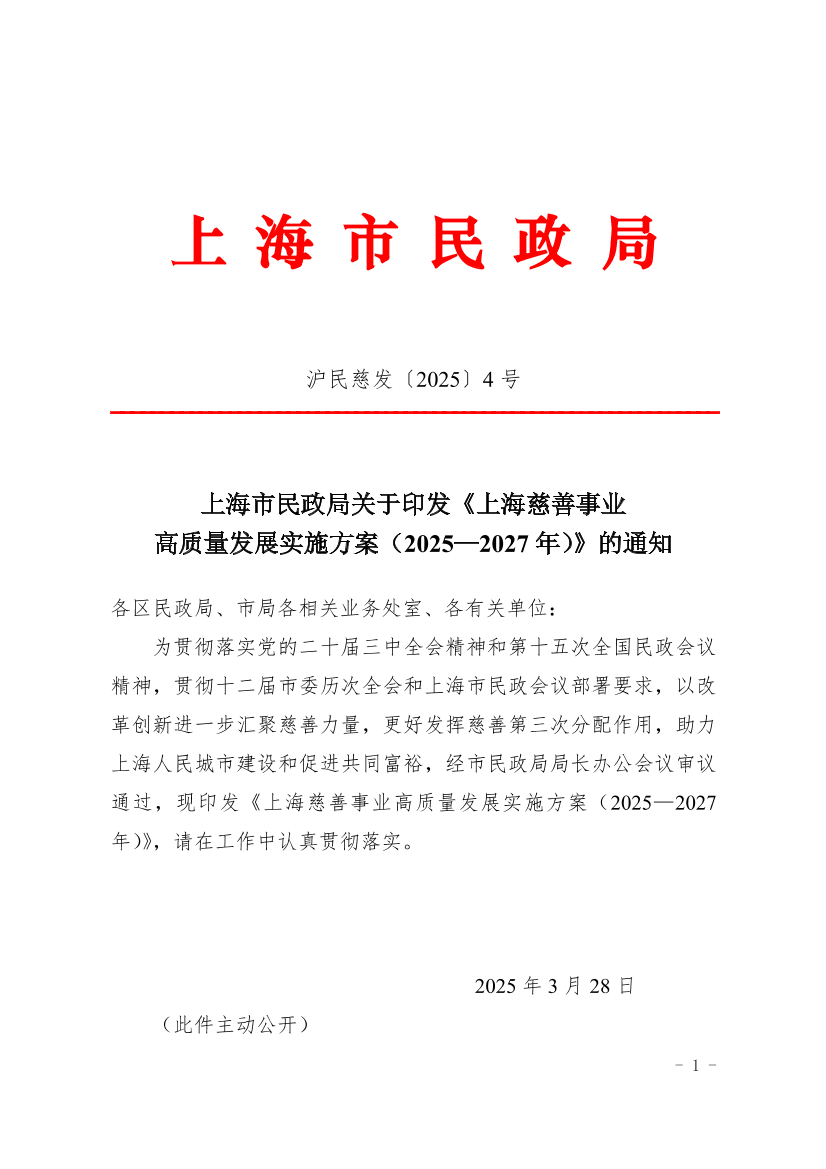 上海市民政局关于印发《上海慈善事业高质量发展实施方案(2025—2027年)》的通知 ( 2025-04-16 )