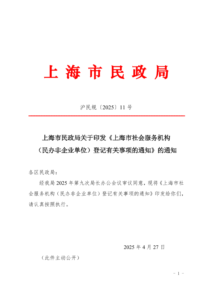上海市民政局关于印发《上海市社会服务机构(民办非企业单位)登记有关事项的通知》的通知 ( 2025-04-28 )