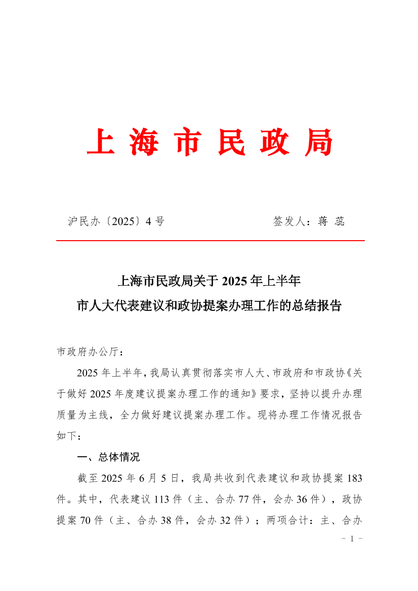 上海市民政局关于2025年上半年市人大代表建议和政协提案办理工作的总结报告 ( 2025-06-16 )
