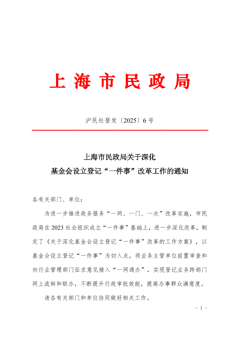 上海市民政局关于深化基金会设立登记“一件事”改革工作的通知 ( 2025-07-11 )