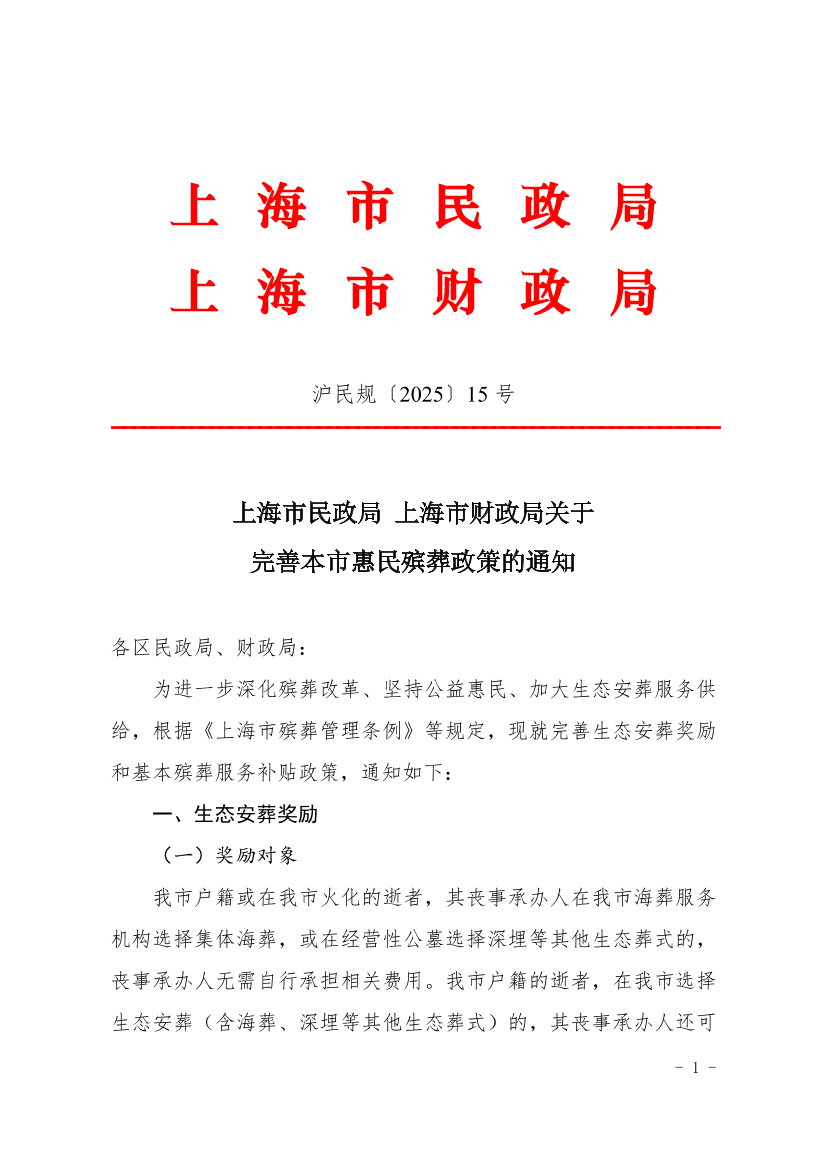 上海市民政局 上海市财政局关于完善本市惠民殡葬政策的通知 ( 2025-10-13 )